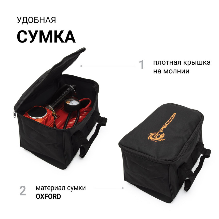 Компрессор воздушный АГРЕССОР, 160 л./мин., 12V/45A, 600W, 10 Атм., съёмный шланг 8 м., клапан для регулир. давления, питание от АКБ, защита от перегрева, защита от перекачки > 8 Атм., набор из 4-х переходников для надувн. изделий, переходники для накач. лодок, сумка