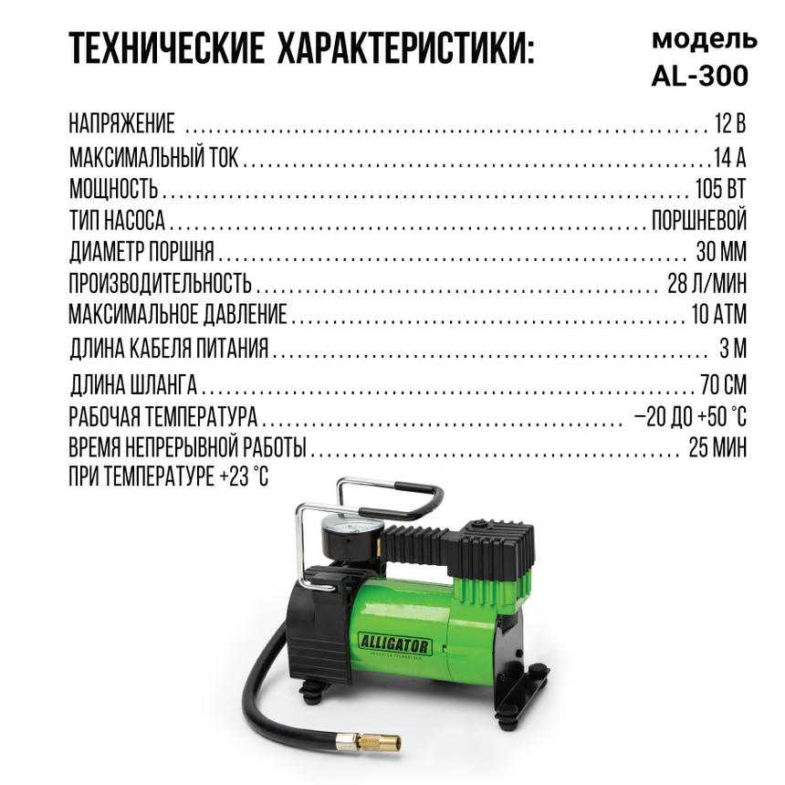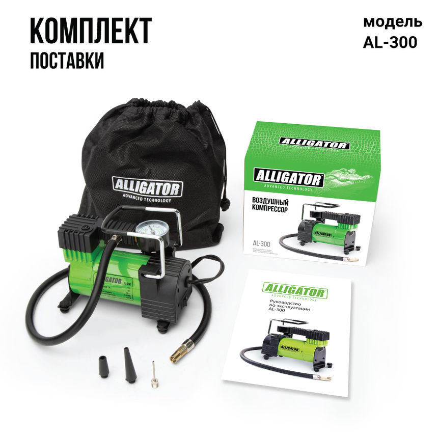 Переходники для мячей и матрацев делают модель практически универсальной. Мощность компрессора — 105 Вт, а максимальное давление — 10 ATM. Компрессор для накачивания ALLIGATOR AL-300 — оптимальное решение эконом-класса для современного автовладельца, мотоциклиста и велосипедиста. Работает при температуре от -20 до +50 °С. В комплекте — удобная сумка для хранения и переноски. Гарантия 1 год.