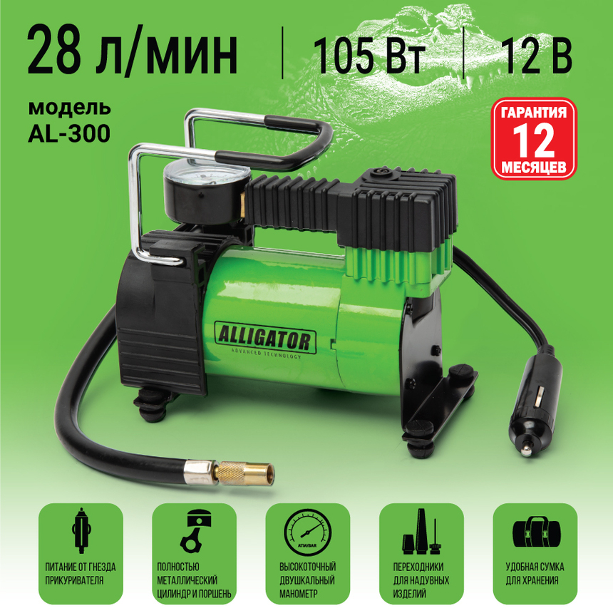 Компрессор воздушный ALLIGATOR, 28 л./мин., 12V/14A, 105W, 10 Атм., шланг 0,7 м., питание от прикуривателя, набор из 3-х переходников для надувн. изделий, сумка