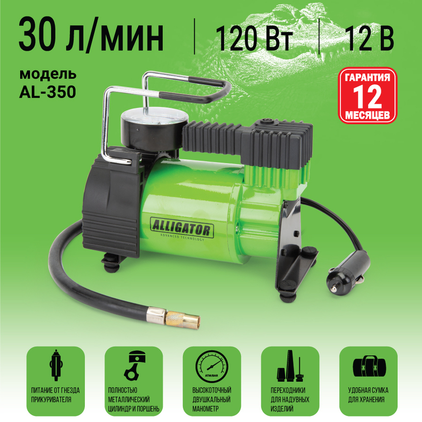 Компрессор воздушный ALLIGATOR, 30 л./мин., 12V/14A, 120W, 10 Атм., шланг 0,7 м., питание от прикуривателя, набор из 3-х переходников для надувн. изделий, сумка