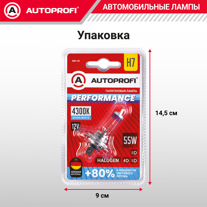 Линейка галогеновых ламп AUTOPROFI PERFORMANCE - лампы с улучшенными техническими характеристиками и световым потоком на 80% мощнее чем у стандартных галогеновых ламп. Расчетный срок службы в трое превышающий обычные лампы. Специальное нанесение на колбу обеспечивает более белый спектр свечения (4300К).