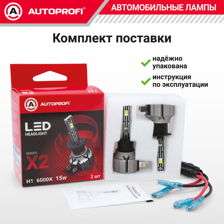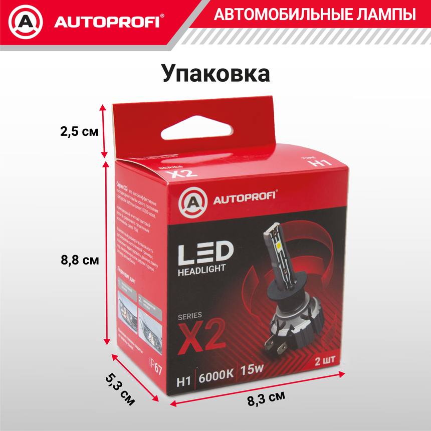 Лампа светодиодная Autoprofi, Х2 компак, H1, 12V / 15W, 6000K, 4000 Lm, комплект 2 шт.