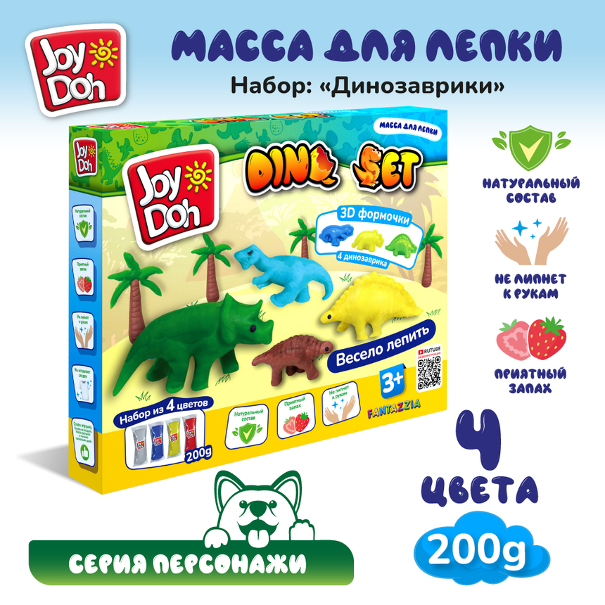 Масса для лепки Joy Doh, набор DINO SET - ДИНОЗАВРИКИ, 3d формы , 9 аксессуаров, 4 пакетика с тестом, (4 x 50 г.)