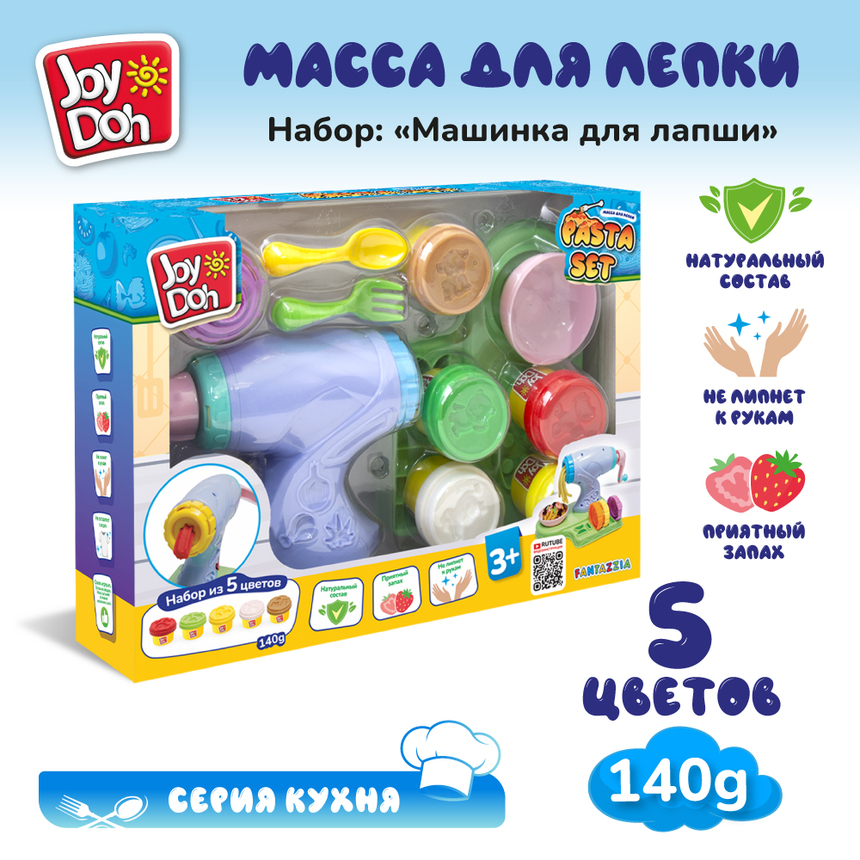 Масса для лепки Joy Doh, набор PASTA SET - МАШИНКА ДЛЯ ЛАПШИ, фабрика пасты, смен. насадки, 4 аксессуара, 5 баночек с тестом,  (5 х 28г.)