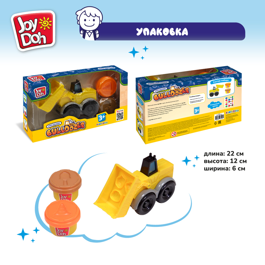Ваш малыш любит строить? Набор для лепки «Mini Bulldozer» от Joy-Doh подойдет маленьким экспертам, разбирающимся в строительной технике. Яркий бульдозер с ковшом и подвижными колесами не оставит равнодушным вашего ребенка. Ковш снабжен пресс-формами для кирпичей и грунта.