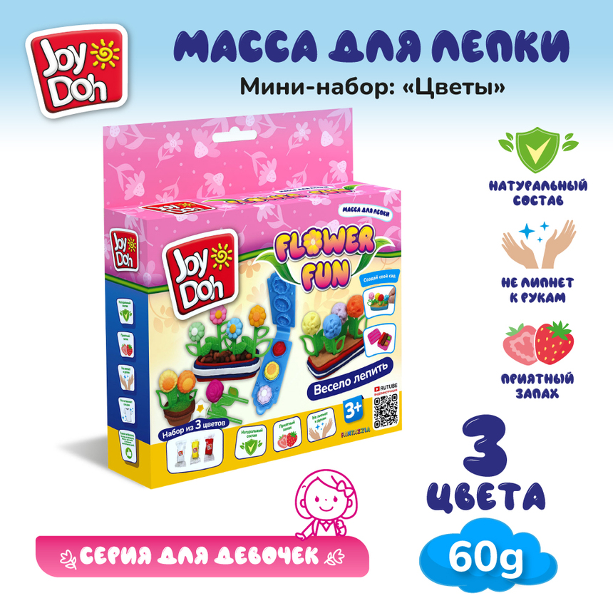 Масса для лепки Joy Doh, набор FLOWER FUN - ЦВЕТЫ, 3D формы цветов, 8 аксессуаров, 3 пакетика с тестом, (3 х 20г.)