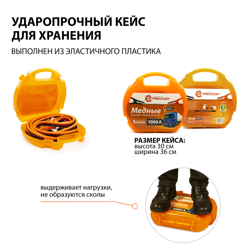 Провода пусковые "Агрессор", 100% медь, 1000 А, морозостойкие, длина 5 м., пластиковый кейс